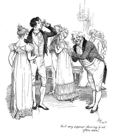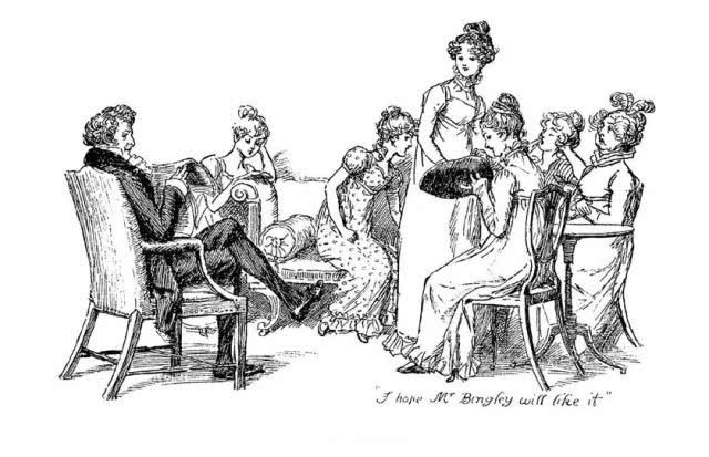 小时候读的那本《傲慢与偏见》出版于 1955年,里面有 40幅插画,是线条精细、流畅的铜版画,从中可以窥到遥远年代、遥远国度的风情。女子盖住脚面的长裙、长到肘部的手套、扎到头顶的卷发,男子的礼帽、燕尾服、竖起的白领、长筒袜或皮靴……还有像一只写字台的钢琴、小小的单屉桌、像奥运会奖杯一样的器皿,以及在起居室里大家怎样谈天,绅士见了小姐怎样鞠躬、吻手等等。伊丽莎白的确很美,标致的脸蛋和身材,胸前还系了一个蝴蝶结。据译者王科一写的“前记”,画家名叫勃洛克( Charles E. Brock),这些插画作于 1895年。